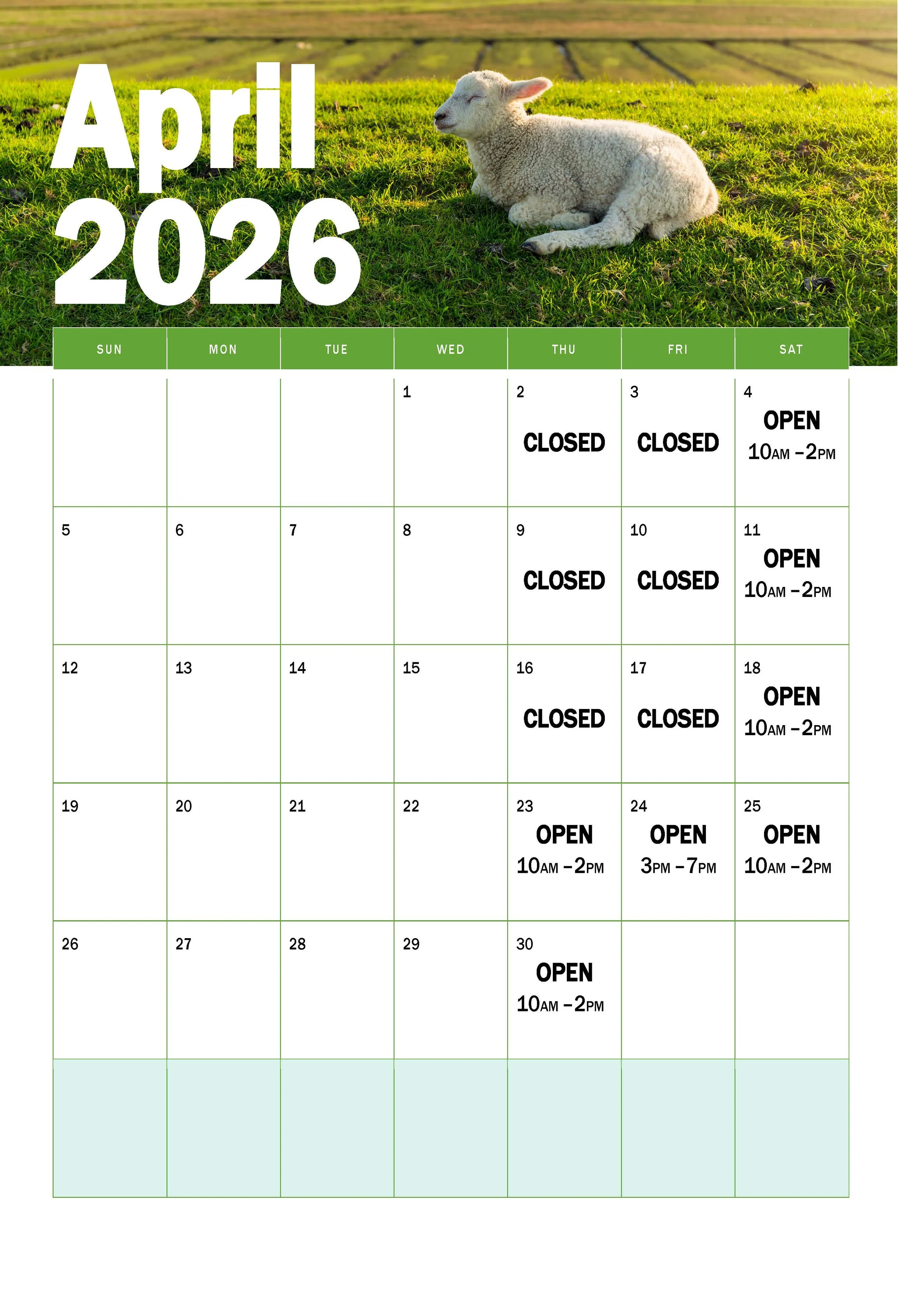 Please be sure to check our April store hours below before heading out to the farm store this month to shop.